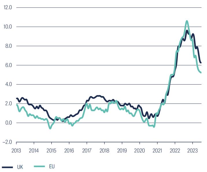 | Source: Bloomberg, FSI as at 31 August 2023. | UK CPIH, EU CPI |
