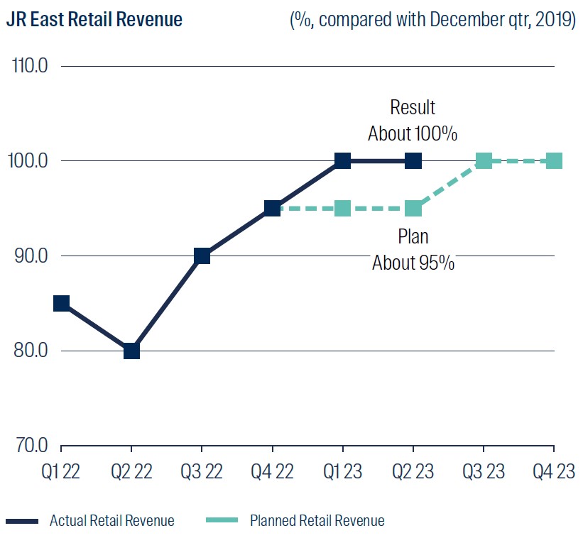 Retail spend per passenger has also recovered to above pre-pandemic levels, highlighting the pent up travel and spending demand present in Japan. Although passenger volumes for JR Central and JR East have not yet recovered to 2019 levels, retail revenue for both companies has already reached 2019 levels owing to increased spend per passenger. The following chart illustrates the recovery in JR East’s retail revenue over recent quarters.