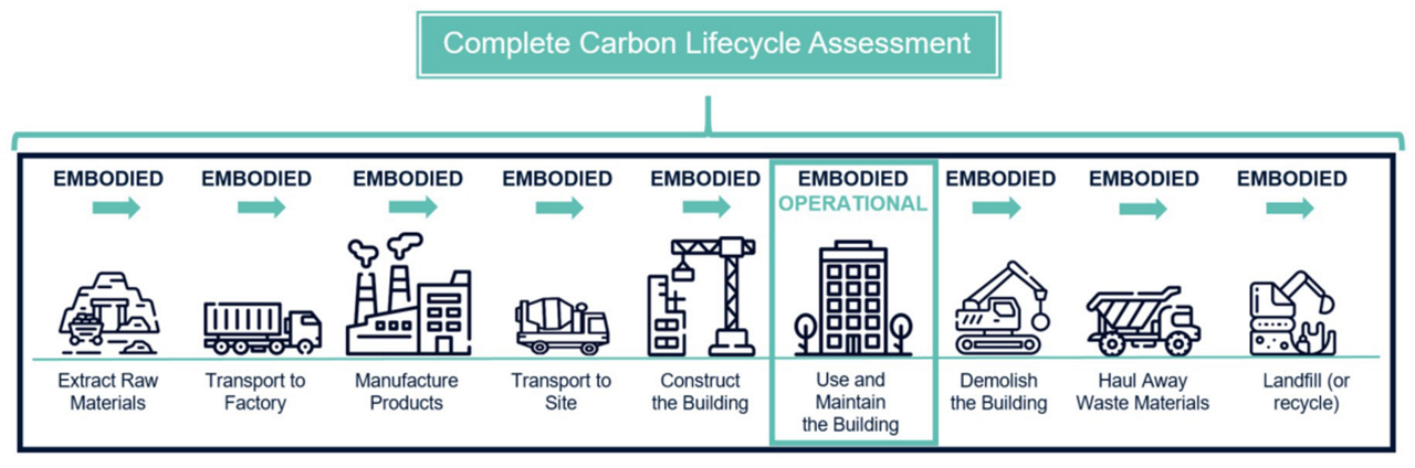 Le carbone au niveau opérationnel provient de bâtiments achevés et est généré par des activités telles que l’éclairage, le refroidissement, le chauffage et le fonctionnement d’appareils.