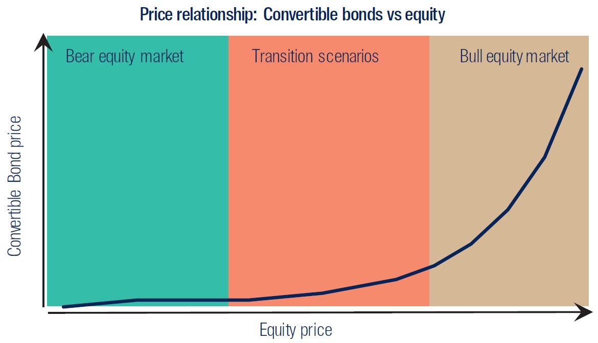 Through the lens of a bond investor, we look at three broad market scenarios: bear equity markets, transition scenarios, and bull equity markets. The relationship between a convertible bond’s price and its underlying equity can be visualized as a convex curve—providing equity-linked upside while cushioning downside risk.