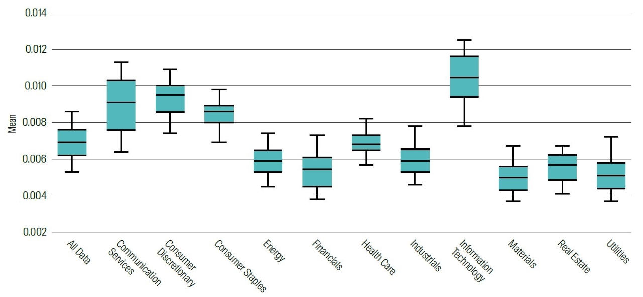 We can go further. When we look at the five underlying corporate values, we can also see that different industries have a focus on different corporate value. This is not surprising. For example, IT firms and communication services have more mentions of innovation but financials talk more about integrity (probably to address previous issues!). The distribution of mentions by sector for the five corporate values are in Figures 2 to 6 below. These charts show the distribution of the mentions with the box representing where the middle 50% (also known as the interquartile spread) of the mentions lies.