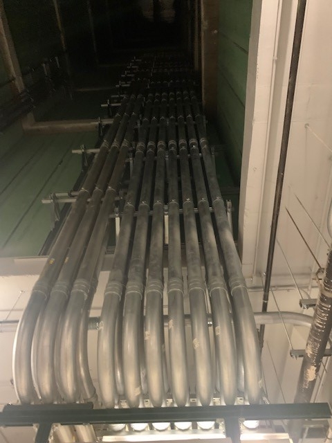 The building’s original design contains four large core lift wells that would ferry large paper rolls and printed materials up and down the building. These risers today contain power and fiber conduits for buildings’ servers. Standing in the basement at the bottom of the large shafts we could feel the heat emanating out of the 12 inch concrete walls as the heat from the servers decimates through the building.