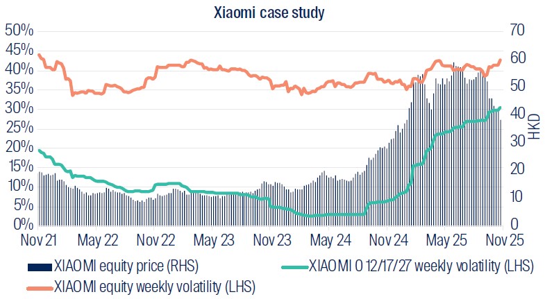 For example, we purchased XIAOMI 0.000 17-DEC-2027 back in late 2023, a year when the Hang Seng Index returned -14% for the calendar year. This 0% coupon, non-rated bond was priced below par at 89 with a yield1 of 5.94% at time of purchase, which providing an attractive yield on par with its longer dated comparable bullet bond, XIAOMI 3 ⅜ 04/29/30 Corp, which yielded 5.93%. Xiaomi was rated Baa2/BBB at time of purchase, so we saw this as a fundamentally sound bond offering attractive income, with a “free” equity option until the bond’s puttable date of December 2025. In late 2024, Xiaomi’s bonds rallied above par, turning its previously ‘free’ convertibility option into positive value. We eventually sold this bond in 3Q 2024 for a profit of 12% as market sentiment and the company’s business cycle turned positive.
