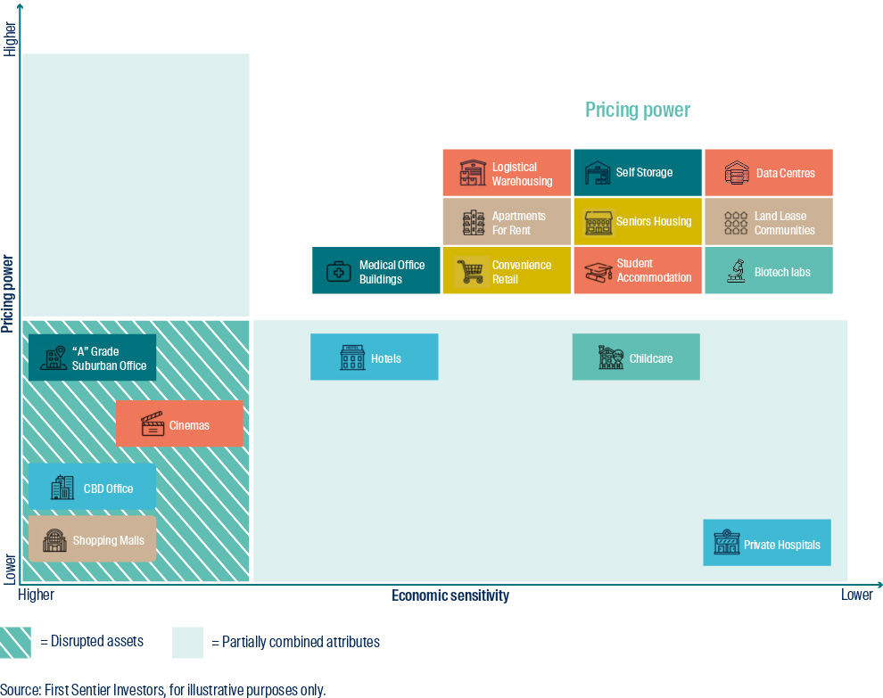 As shown in Chart 4, the majority of the listed property sector assets are positioned in the top right quadrant. These assets exhibit strong pricing power, which drives the inflationary hedge with low economic sensitivity.