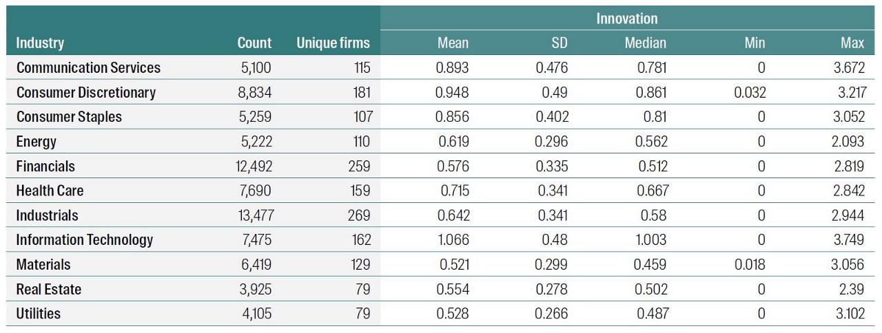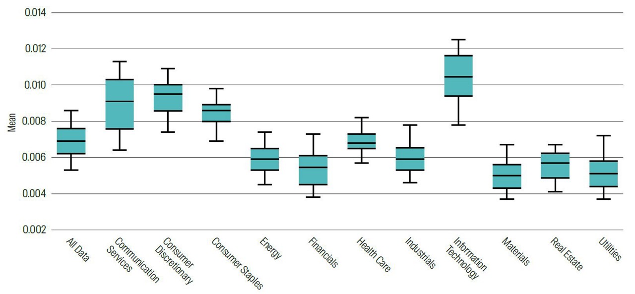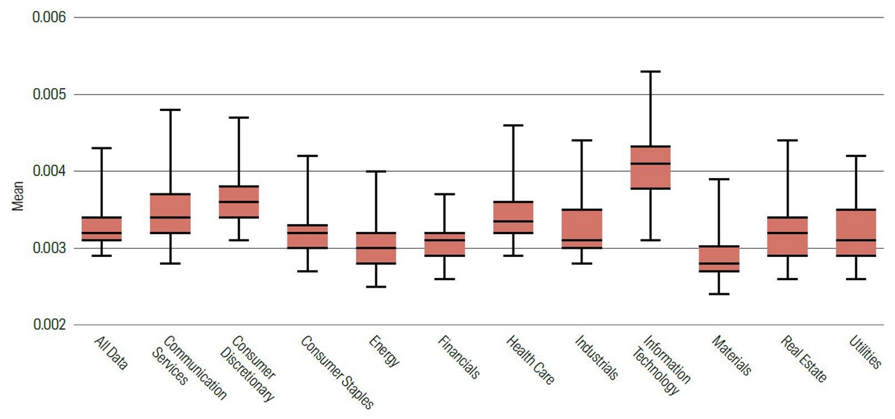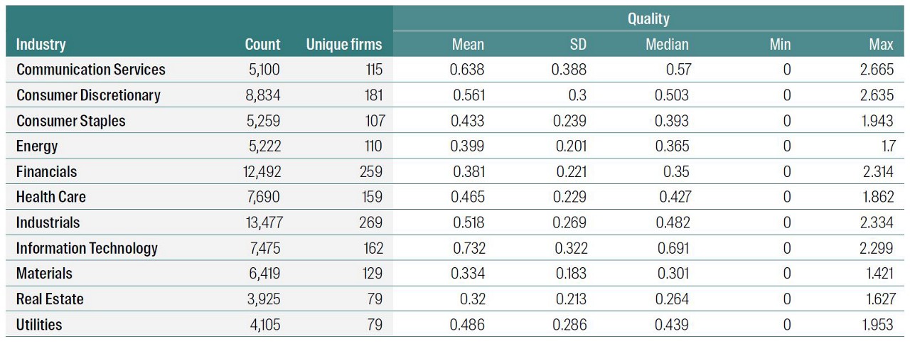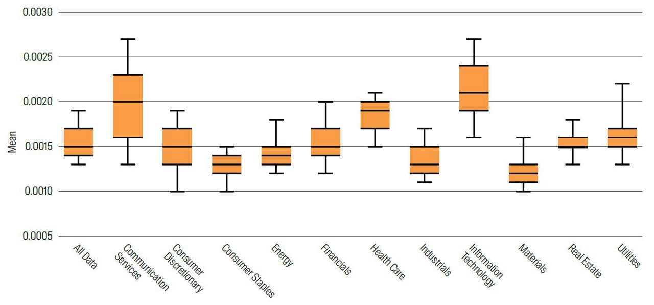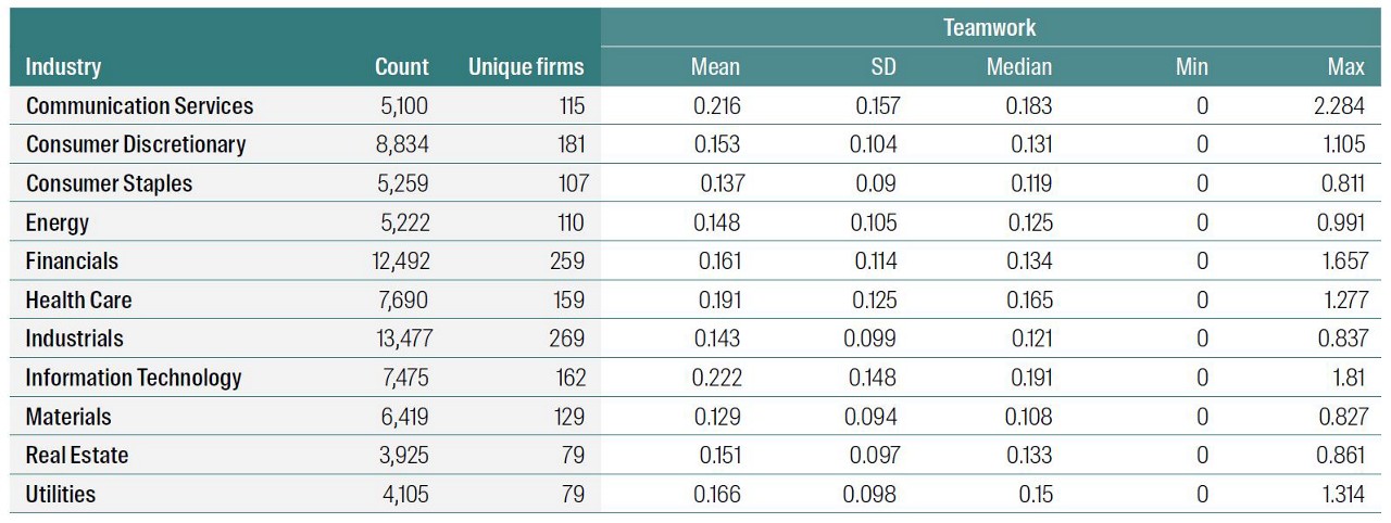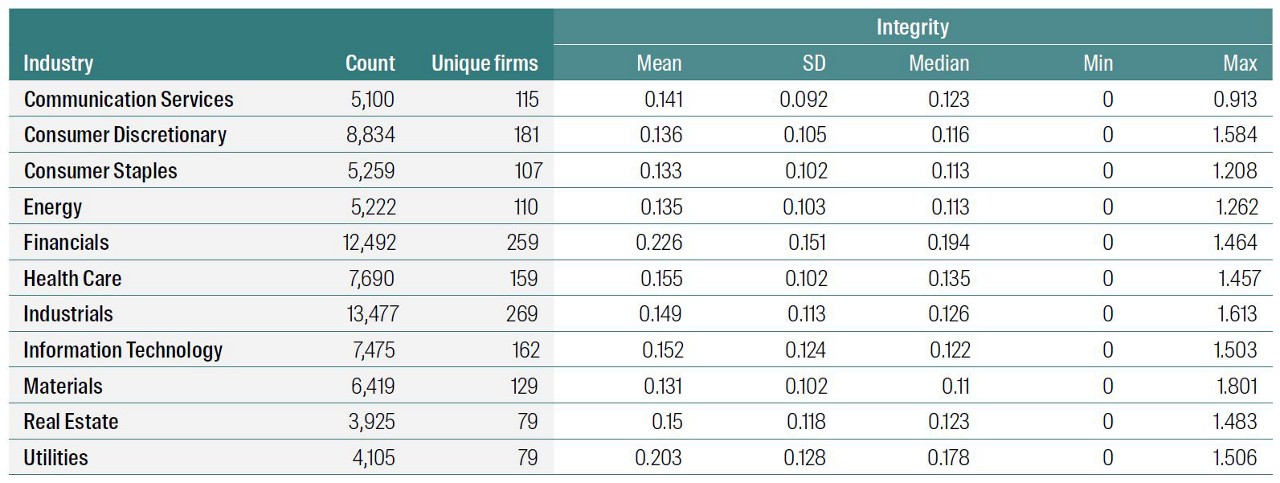 We go further to provide some descriptive statistics for each sector – both at the overall level as well as split out between the five different corporate values. See Table 1 below. What is interesting is that it is only the value ‘respect’ that is mentioned across all firms over time. For other values (e.g., integrity, teamwork and quality), there are at least some firms within the sectors that do not mention any of the words associated with the value in the conference call (as shown by the score of 0 for the min value).